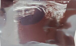 かなり腫れていて荷重不可能、エコーを撮ってみたら腓骨下端に裂離骨片が写りました😱